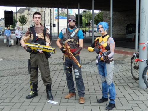 À partir du moment où l’on a décidé de participer à la Gamescom, deux choix se sont présentés à nous : faire un nouveau costume pour chaque personne en un mois (chaud), ou reprendre les costumes de Skyrim et laisser Joris en civil (un peu trop facile !). Après délibération, nous avons opté pour la première solution et entamé la recherche de nos futurs modèles. Il est mine de rien assez difficile de trouver un groupe de personnages issus de la même franchise et dont les costumes peuvent être réalisés dans un laps de temps aussi court. Nous avons tout de même trouvé notre thème : Borderlands et ses chasseurs de l’arche : Mordecai (Mael), Maya (Marie) et Axton (Joris…).