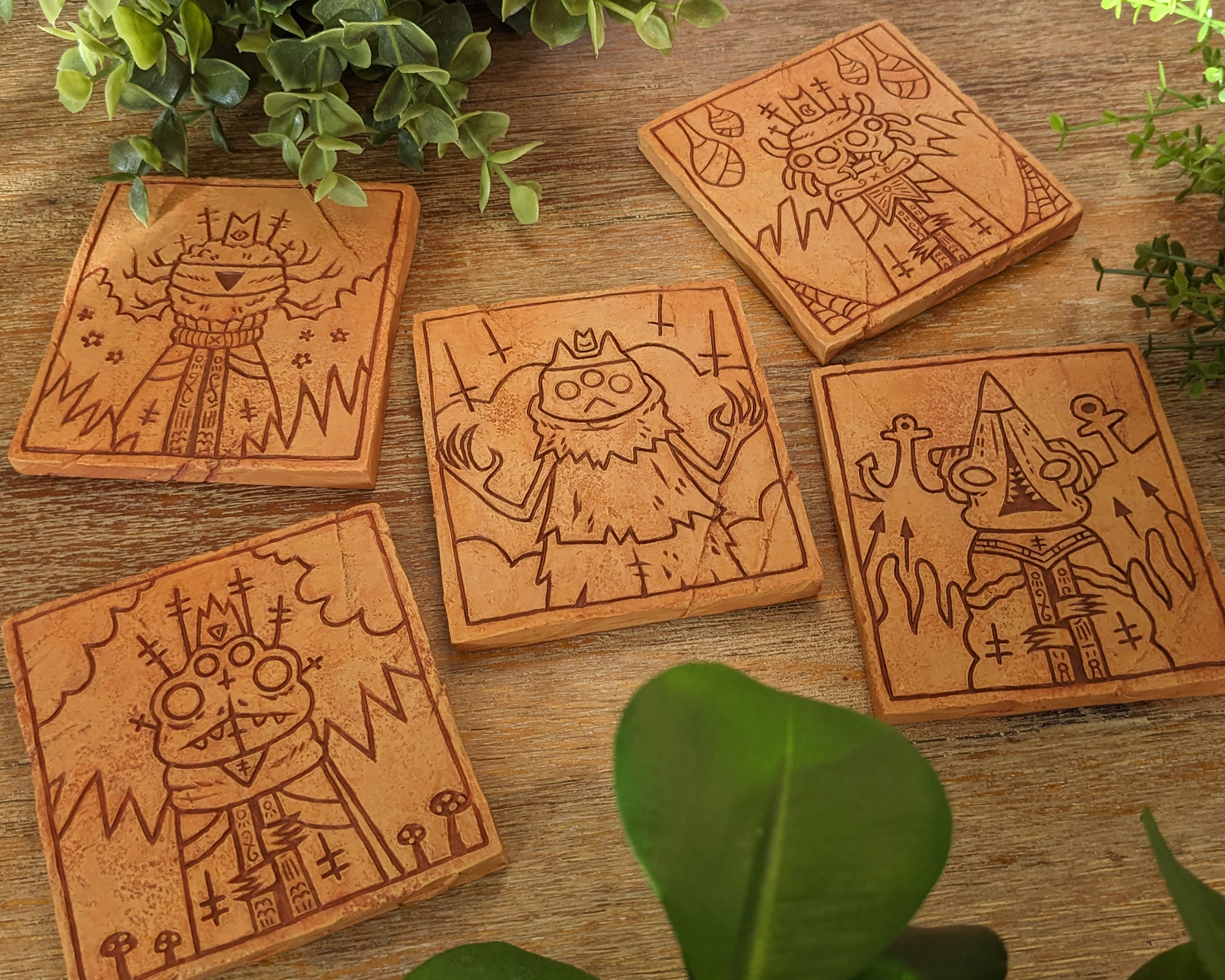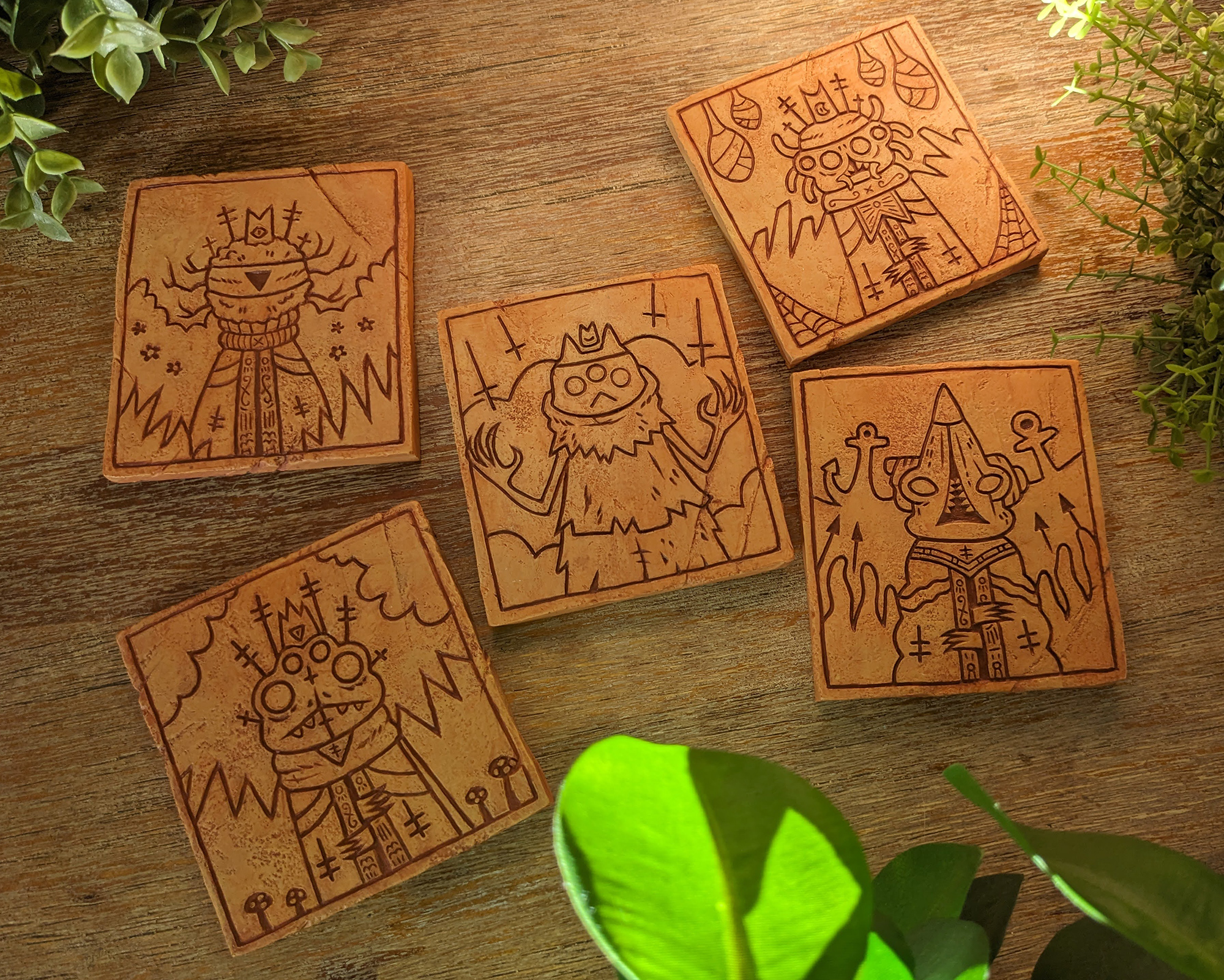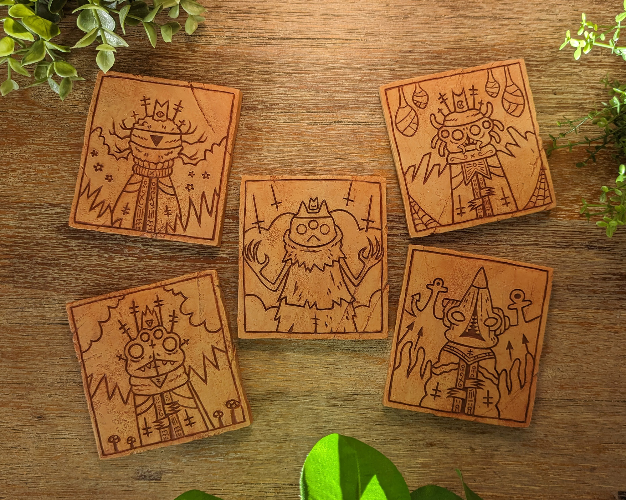 Tablets inspired by the video game Cult of the Lamb, featuring the gods Bishops of the Old Faith.